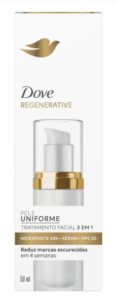 O Tratamento Facial 3 em 1 Dove Regenerative FPS 30 é um sérum inovador que combina hidratação intensa por 48 horas, proteção solar eficaz com FPS 30 e ação regenerativa para uniformizar o tom da pele. Desenvolvido com Tecnologia B3 Pro, que une niacinamida e pró-retinol, este tratamento promove firmeza, reduz marcas escurecidas em até 4 semanas e reforça a barreira protetora da pele, garantindo um cuidado completo e diário para todos os tipos de pele.