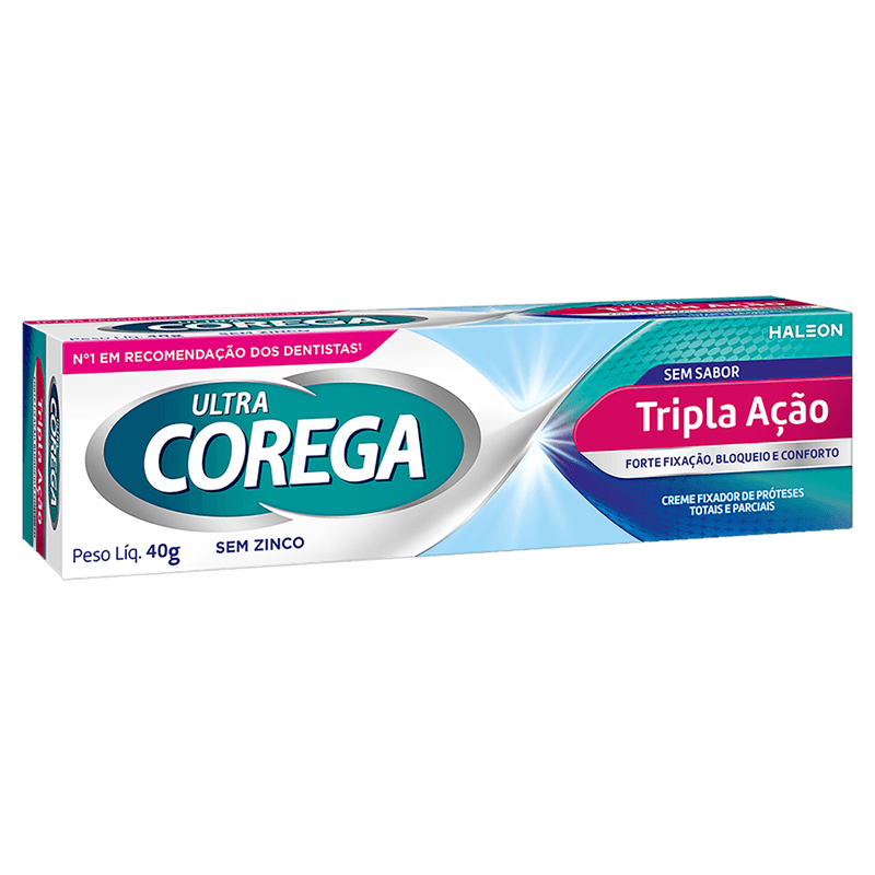 OUltra Corega Tripla Ação Creme Fixador de Próteses Sem Sabor oferece segurança e conforto para maior liberdade no uso da dentadura. O Creme Sem Sabor possui fixação de 12 horas, sela a prótese, evitando a passagem de partículas de comida e prevenindo irritações entre a gengiva e a prótese. Sua fórmula é livre de zinco e sem sabores artificiais.