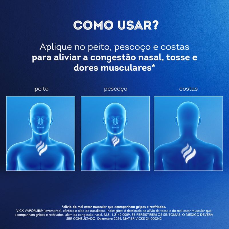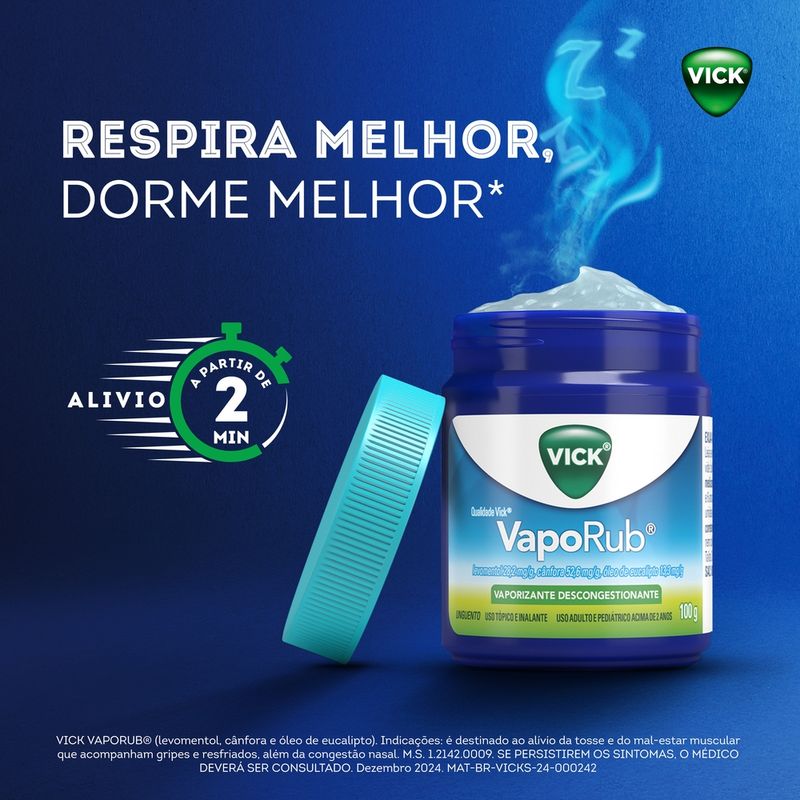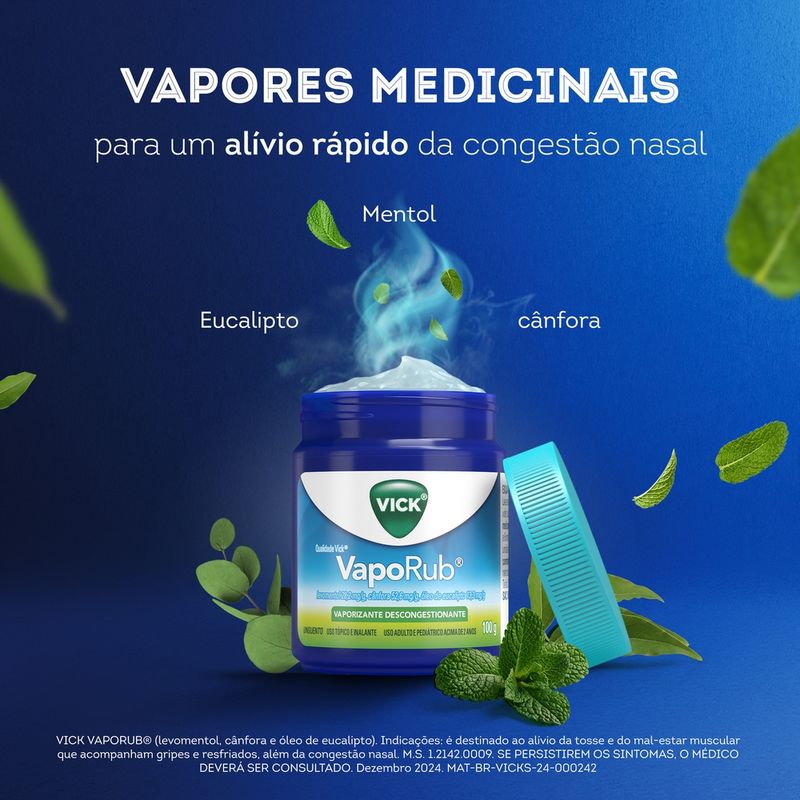 O Vick VapoRub é indicado para o alívio da congestão nasal, facilitando a respiração em casos de resfriados e sintomas gripais. Destina-se ao uso adulto e pediátrico acima de 2 anos.