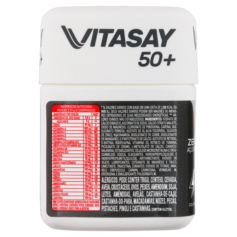 O Vitasay Multivitamínico A-Z para Homens 50+ com Cafeína é um suplemento alimentar especialmente formulado para homens a partir dos 50 anos que buscam mais energia, vitalidade e concentração no dia a dia. Com uma combinação completa de vitaminas A, C, E, complexo B e minerais essenciais como cálcio, magnésio, ferro e zinco, além de 100 mg de cafeína por dose, este produto oferece suporte nutricional eficaz para o metabolismo e o sistema imunológico, sem adição de açúcares.