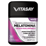 Este suplemento atua promovendo um sono mais reparador e contribuindo para a hidratação e saúde da pele, cabelo e unhas. Sua fórmula em cápsulas gelatinosas moles facilita a ingestão e absorção dos nutrientes. O Vitasay Melatonina + Ácido Hialurônico é registrado na Anvisa (MS 117018), classificado como venda livre e indicado para adultos que desejam aliar descanso de qualidade a cuidados estéticos. Este produto não substitui uma alimentação equilibrada e seu consumo deve ser orientado por nutricionista ou médico.